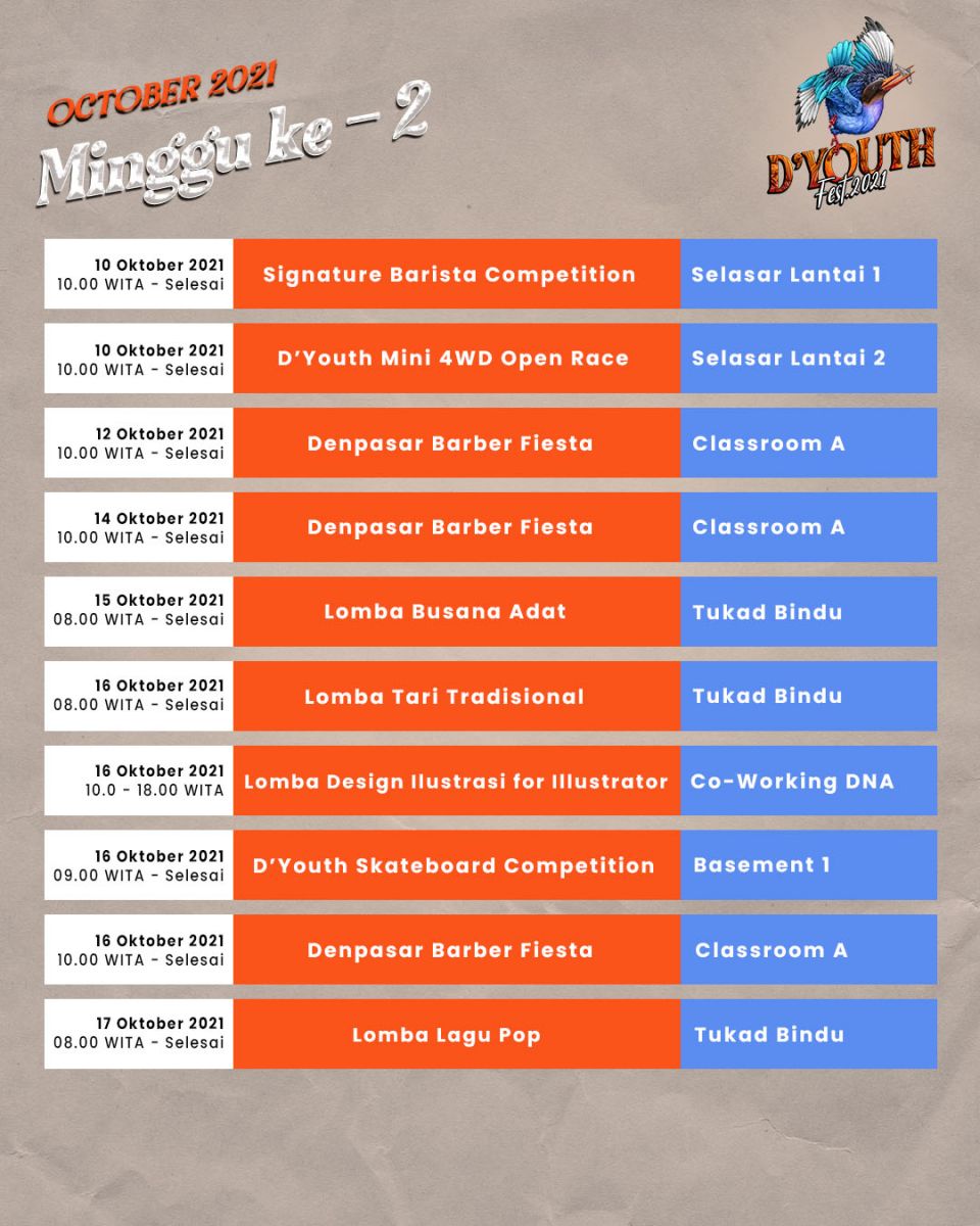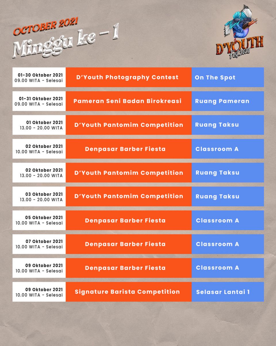 Kreativitas tak akan pernah bisa dibendung. Sebuah hybrid (offline - online) event akan di gelar dengan menerapkan protokoler kesehatan penuh di kota Denpasar selama sebulan. Selamat datang dan bergabung seluruh insan kreatif muda Denpasar di D'Youth Fest 2021
